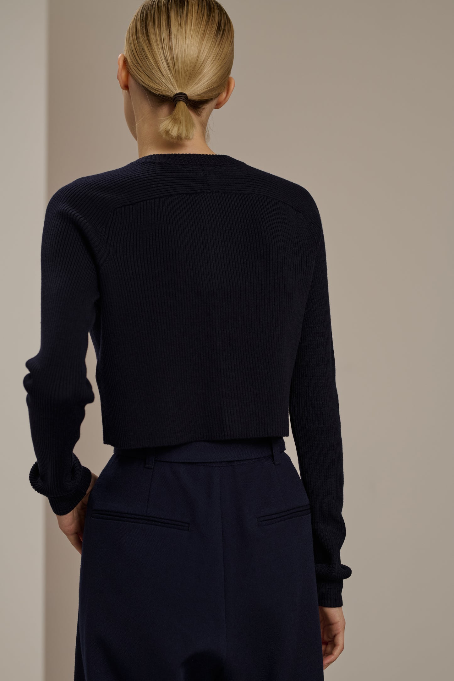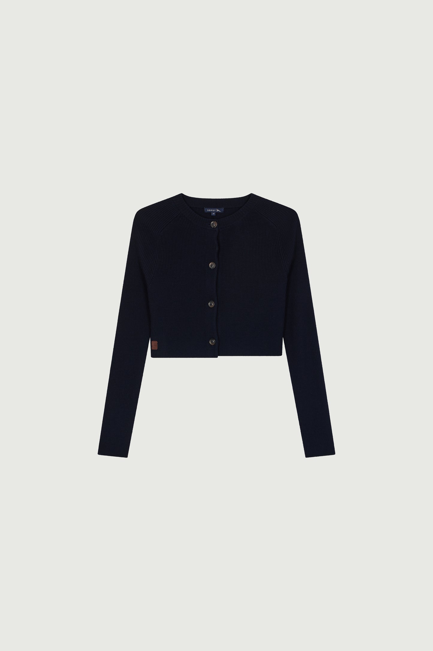 WALDEN is a ribbed stretch knit cardigan with a cropped cut. It can be worn directly on the skin or layered over a long shirt. It is part of our line of knits embroidered with the "S" monogram. This version is made from fine and warm merino wool.